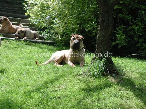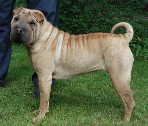 Der chinesische Standard hat auf sehr malerische Weise das Aussehen des Shar-Pei beschrieben: Ohren wie Muscheln, die Nase wie ein Schmetterling, der Kopf groß wie eine Melone, Großmuttergesicht, der Hals wie beim Nilpferd, das Hinterteil wie beim Pferd und die Beine wie beim Drachen.